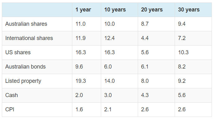 Over the last 30 years the top performing asset class was US shares with an average annual return of 10.3 per cent. Australian shares (9.4 per cent) and listed property (9.2 per cent) were not far behind.